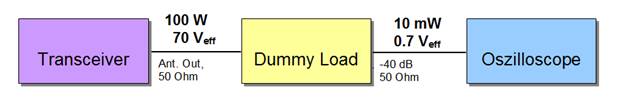 40-dB-Auskopplungsdämpfung des Dummy Load wird ein Oszilloskop zur Messung der