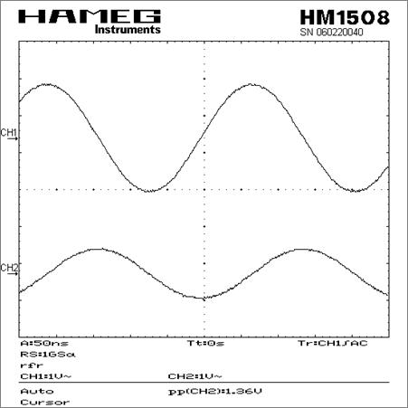 welcher der Träger auf eine Spannung von 3 Vss gedämpft wird. Zum Vergleich zeigt Kanal 2