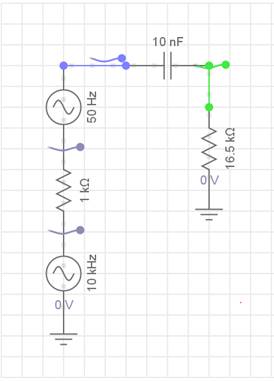 Passive RC high-pass connected to an emulation of a transformer, a 50 Hz
